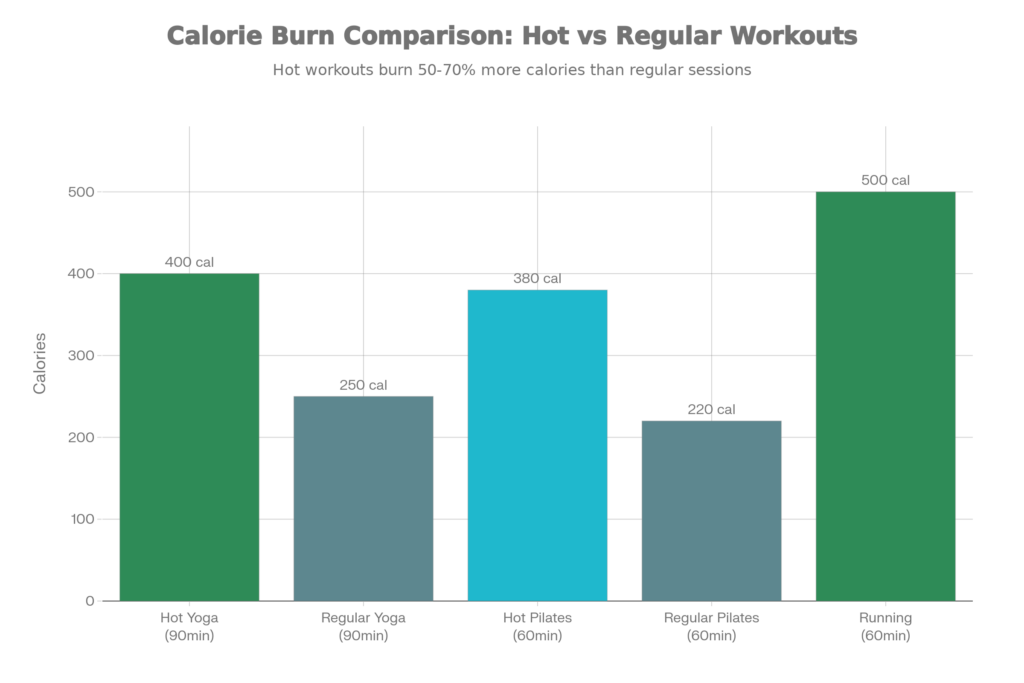 Studies show people burn more calories in heated classes. For example, a 90-minute hot yoga session averages around 400 calories, compared to 250 in a regular class. Hot Pilates burns about 380 calories in 60 minutes.